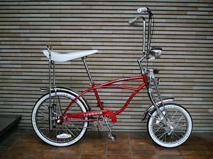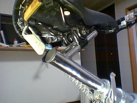 | (2005,4,12) はじめまして。熊本県在住の「Dat U Know?」と申します。 やお様のホームページを拝見しました。 やお様が紹介されている改造、とても興味深く読ませていただきました。 私も先日同じタイプの自転車を購入しました。(フォルテではなく無名の類似品ですが(汗)) 私のは“もどき”ですが写真で見る限りフレームもバッテリーもコントローラも同じっぽいので、HPの記事はとても参考になります。 さて、私のフォルテもどきについて、乗ってみて思ったんですが、サドル高さを上げると後ろに下がってしまって、「手と足は前でお尻は後ろ」というかなり窮屈な姿勢になってしまいます。 やお様の愛車の写真を見ると、シートポストから60度くらいの角度でバーが前に出てて、それにサドルが取り付けてあるようですが、これは購入時からの仕様なのでしょうか? 私のシートポストは一本物(?)でした(涙) もし、交換されたパーツなら入手方法を教えていただけないでしょうか? P.S.初メールで質問ばっかりで申し訳ありません。HPの記事、楽しみにしてます。 (私も何か投稿したいのですが、ビギナーなので当分はHPで勉強させていただきます。) (^^) 「Dat U Know?」(だっちゅーの)様 (僕も同じ“ボキャ天”世代(^^)) はじめまして、ヤオでございます! こんばんは!(^^) 本日は平日で仕事ですので、返事が遅れましてすみませんでした。 感想をどうもありがとうございます。拙HPに興味をもってもらえて、管理人として嬉しいかぎりです。 『フォルテもどき』おおいに結構じゃないですか! ドンドンうちのHPの情報を使って下さいませ! とは言うものの……。 お問い合わせのサドルの件なんですが、「Dat U Know?」様にとっては残念ですが、これは最初からの仕様なんです。 いちおう写真をアップしときましたので、どうか参考にして下さいね。(↓の写真です) ところで > サドル高さを上げると後ろに下がってしまって、 >「手と足は前でお尻は後ろ」というかなり窮屈な姿勢になって 想像してしまって、失礼ながら、もうちょっとで笑ってしまうとこでした。(^^) ほんとに、フォルテって、へんなサドルですよね。 高さを調整したいだけなのに、前後にも移動してしまいます。 カッコ良さを優先させたそのツケなんだと思いますが、たしかにご指摘通りこれはフォルテの弱点なんだと思います。 どうかサドルの改良に成功されたら、お願いですから写真の一枚でも恵んでくださいまし。 きっと、同じ悩みを抱えている誰かのお役に立つはずです。 よろしくお願いします。   やお様 早速のお返事ありがとうございます。 アップしていただいた写真拝見しました。(ヤオ注:↑の写真です。^^) やっぱ「仕様」だったんですねorz 週末にでもシートポスト探しの旅に出たいと思います。 実は、サドルを前に持ってくる方法のほかに、ハンドルをママチャリみたいなU字のヤツに交換して上体を起こす、「リカンベント風」または添付ファイル(ヤオ注:↓の写真ですね!^^)みたいにチョッパーハンドルで「ローライダー風」みたいなスタイルはどうかな、なんて考えてます。(^^ゞ (でも配線やブレーキ、ギアのワイヤーも交換が必要になりそうで、難しいカナ?) なんか、やる気が沸いてきました。 手に入る部品で目論見がうまくいったら報告させてください。 どうもありがとうございました。  (^^)うおおおっ!! これはかなりキているアレで、アレでございますこと! さりげなく後車輪が大きくて、ナメたらブッちぎられそうです。 でもメール内容によりますと、これは単なる参考写真のようですので、本チャンの「Dat U Know? フォルテ」、もう、それはもの凄く期待していますので、がんばって下さい! 「Dat U Know?」様のご健闘を祈ります! |